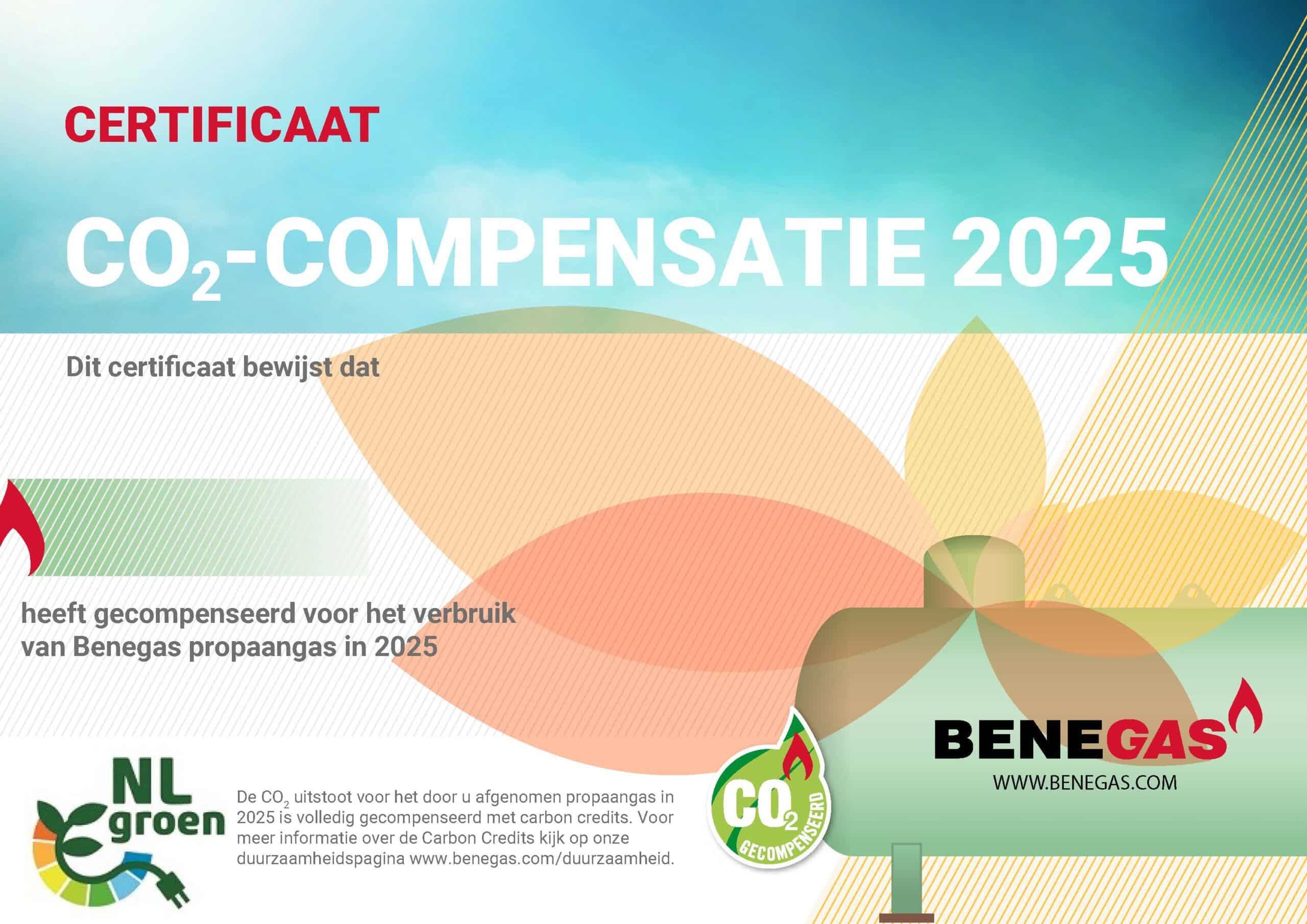 Als klant van Benegas ontvang je jaarlijks een certificaat als bewijs dat de CO2-uitstoot van jouw propaangas volledig is gecompenseerd. Zo kies je met een goed gevoel voor een duurzamere energieoplossing. Samen maken we het verschil!